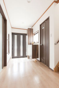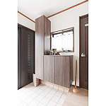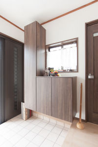 床から浮き上がったような玄関収納コンポリア。扉と同じウォールナット柄で、シックでモダンな玄関を演出。「傘も見えないようすっきり収納したい」という奥様のご要望で玄関はいつもキレイに。