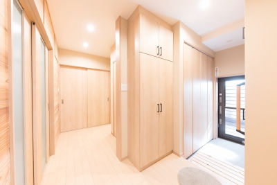 キッチン内にあった勝手口を移動させ、玄関収納コンポリアを設置することで大容量の収納スペースを確保。