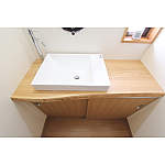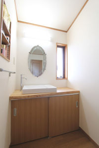 洗面カウンターは一枚板でご夫婦が選んだこだわりのひとつ