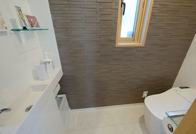 壁をくり抜きスリムな収納棚と手洗いカウンターを設けたトイレ。アクセントタイルでおしゃれな空間に。