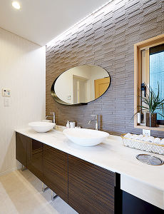ゲスト仕様の洗面室。特注の人造大理石カウンターに洗面ボウルが映えるベッセルタイプで、壁は調湿効果のあるアクセントタイルに。