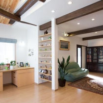 柱と襖で構成された建物には、随所に耐力壁を入れて耐震補強を行い、断熱性能も高めています。大昔は馬二頭のいる作業場だったという台所は、隣の寝室を取り込んで拡張し、収納や家事コーナーを併設した機能的なキッチンに。昔ながらの太い梁や建具が先進設備と調和した、江戸時代のエスプリが漂う味わい深い空間となりました。ダイニングには歴史に造詣の深いG様のために書斎コーナーを設け、ゆったりとした思索の時間を楽しまれています。