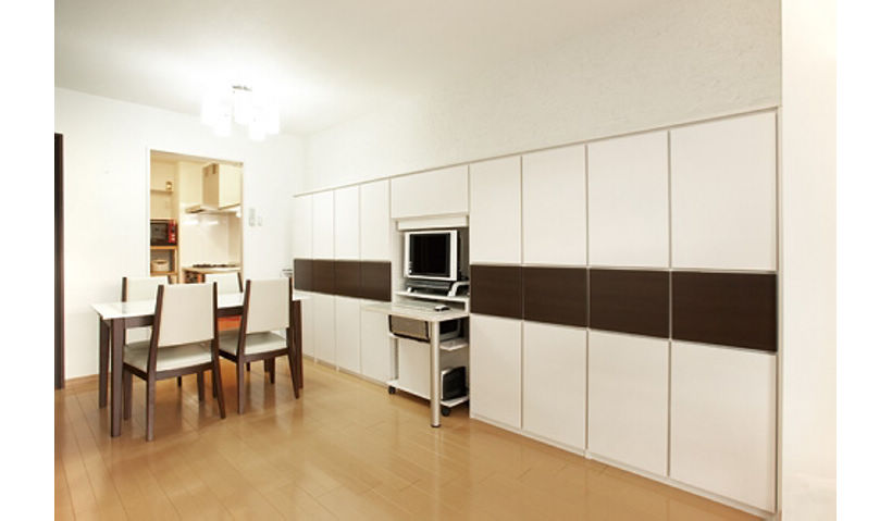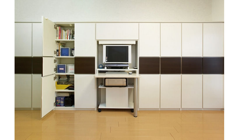 以前のリビングにはモノがあふれていたため、壁一面にシステム収納を採用。その一部にPCコーナーも組み込みました。勉強に集中できる個室とリラックスできる快適なリビングの双方が、受験勉強をしっかりサポートします。