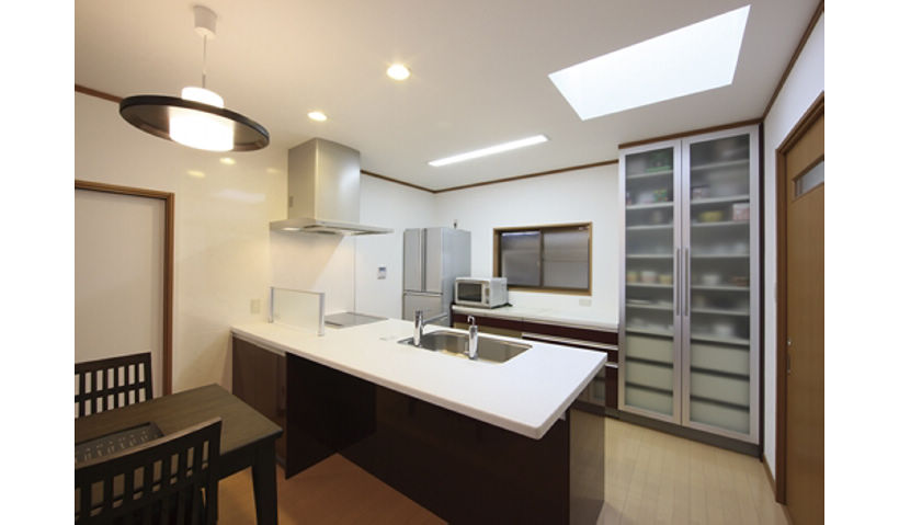 LDKと水まわりの位置を入れ替え、家族が集いやすいようLDKを家の中心に。南北に長い20畳の大空間には、南側に大きな窓を、北側のキッチンの上に天窓を設け、光に満ちた明るい空間を実現されました。限られたスペースで二世帯分の収納量を確保するため、各部屋はもちろん小屋裏までも収納として活用。お母様と3人が仲良く快適に過ごせる、共有型二世帯住宅が完成しました。