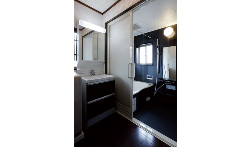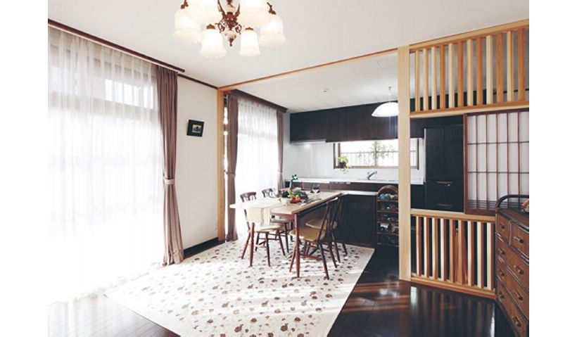 築29年を経て水廻りの老朽化が気になっていたM様ご夫妻。暗かった台所は、間仕切りを撤去することで、明るく開放感のあるLDKとなりました。構造上抜けない柱は、以前、和室にあった障子を再利用して、空間をゆるやかに仕切るデザイン壁に。長年愛用してきた食器棚は塗装し、上段は飾り棚に、下段はキッチンのハッチカウンターとして生まれ変わりました。家具やキッチンの扉はエクセルダーク色でまとめ、和モダンな雰囲気を演出。愛着ある家具に囲まれた、心落ち着く二人のくつろぎの場所ができあがりました。