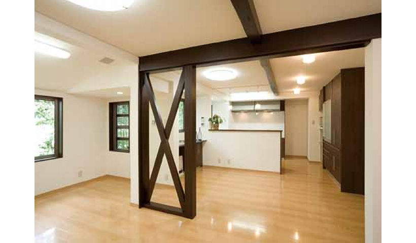 百年余りの年月を経て、傷みも増した建物には、構造的に強度が不安な状態でした。そこで、必要な部分には柱の入れ替えや補強材を入れるなど、長く安全に暮らせるための改修・補強を実施。広すぎて使いにくかった独立型キッチンも、奥行きを増築したことで家族と対話が出来るオープン&対面カウンターキッチンに。補強を兼ねた梁と筋交いが、横へ広がる大空間を美しく引き締めてくれています