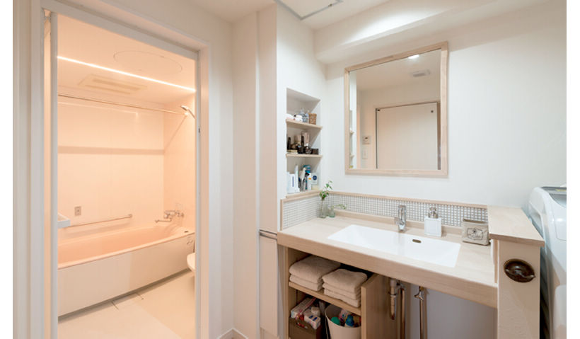 また、二つあった洋室を一つにまとめた寝室横には、ベランダからの通路も兼ねたウォークインクローゼットを設計。「乾いた洗濯物をすぐにクローゼットにしまえるんです」とうれしそうに語る奥様。お気に入りの空間に機能的な動線が加わって、大満足のご様子でした。