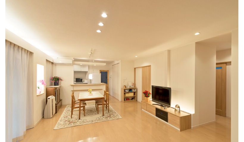 中でも、居心地の良さに大きく貢献しているのが全面に取り入れたLED照明。玄関ホールやリビング、キッチンなどに取り入れられた間接照明・建築化照明によって、やわらかい灯りが家全体を包み込みます。照明全体はライティングコントロールによって調色・調光も思いのままに。シーンによってさまざまな灯りが使い分けられるため、家族の団らんを気持ちよく演出。「節電にもなって一石二鳥です」と、生まれ変わったわが家を満喫していらっしゃるようです。