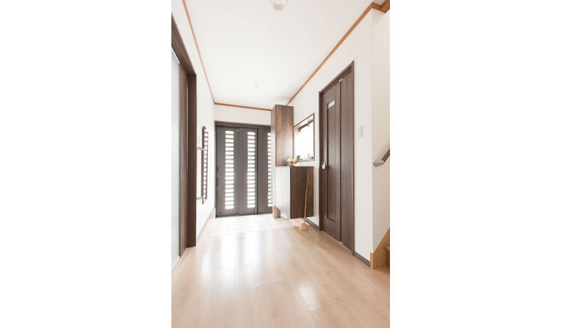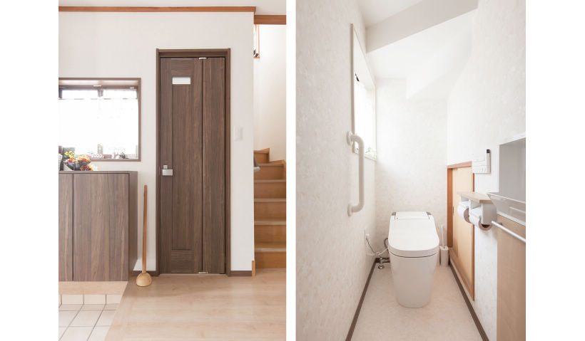 アフター:これからのことを考えて、バリアフリーにすることもリフォームのテーマの一つでした。車椅子の使用にも耐える、傷つきにくい床材を採用し、玄関の上り口には手すりを設置。家の中の段差は徹底的に排除されました。