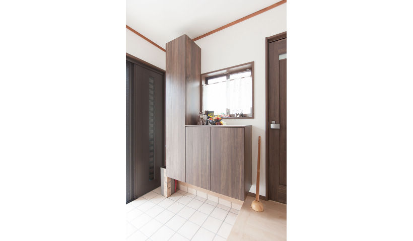 アフター:床から浮き上がったような玄関収納コンポリア。扉と同じウォールナット柄で、シックでモダンな玄関を演出。「傘も見えないようすっきり収納したい」という奥様のご要望で玄関はいつもキレイに。