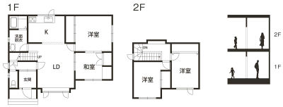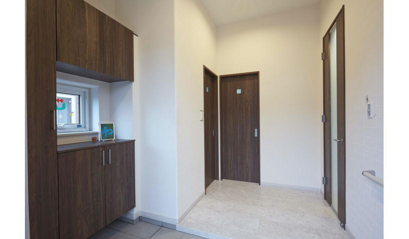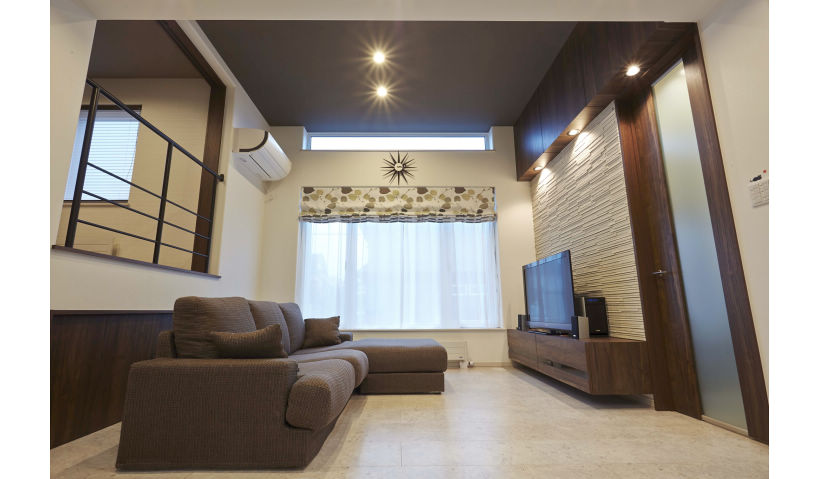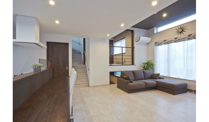 ご家族が増えて玄関やLDKも手狭になり、何かとお困りだったM様。そんなお悩みをすべて解決できるよう、1階は部屋数を変えずに、リビングの天井高を90センチ高くした「プチ吹き抜け」を採用。屋根や壁、基礎を外断熱にすることで小屋裏空間を減らし、その分、縦に広い伸びやかな家族の共用空間が生まれました。
