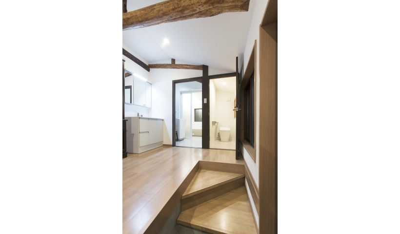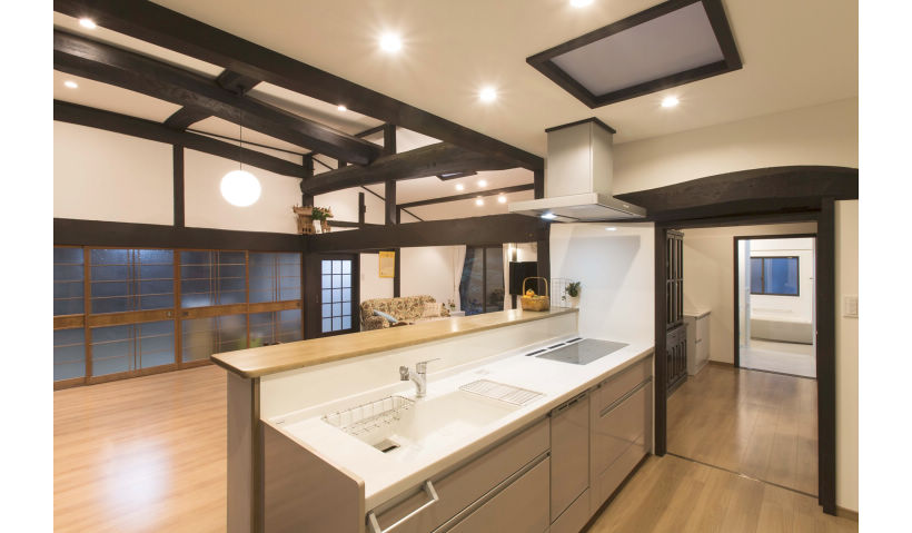 代々住み継がれてきた蔵のある大きなお屋敷のS様邸。お子様も独立され、住み慣れた大切な家で今後の人生をゆっくり過ごしたいという想いから、リフォームすることに。南西に位置し、陽の光を遮っていた蔵を解体し、リビングと一体感のあるオープンデッキに。明るく広々としたリビング空間が実現しました。また、天井を取り払い圧迫感を解消。既存の梁は磨き上げてあらわしに。今も昔も家族を支え続ける逞しい骨組みとともに、天井も高く伸びやかに広がる開放的な空間を実現しました。