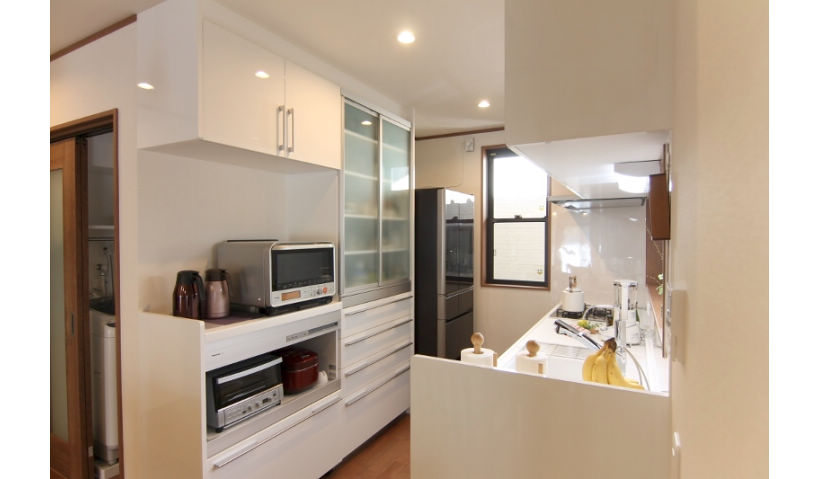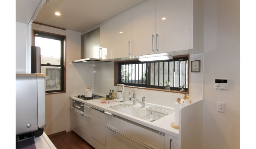 収納場所も十分に確保でき、ホワイトの扉で北側キッチンでも明るくスッキリ。キッチン部のエンドパネルはリビングから手元が