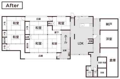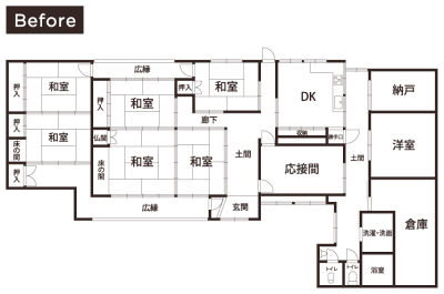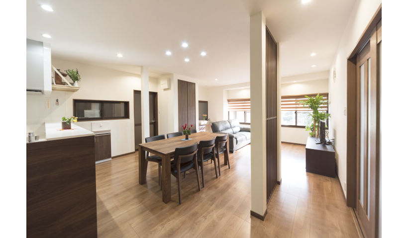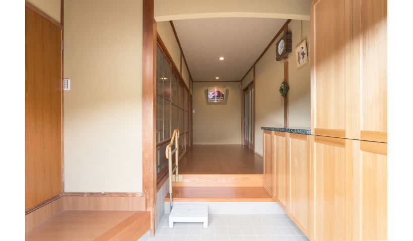 昔ながらのお屋敷で玄関と台所が土間にあり履物を履いて移動せねばならず、座敷とは50センチほどの段差があるなど、不便を感じていたS様。お孫さんとの同居をきっかけに、既存のダイニングキッチンと応接間を一体のLDK空間に。土間部分はフローリングの廊下とし移動もスムーズになりました。段差も少なく、三世代が心地よく過ごせる住まいに生まれ変わりました。
