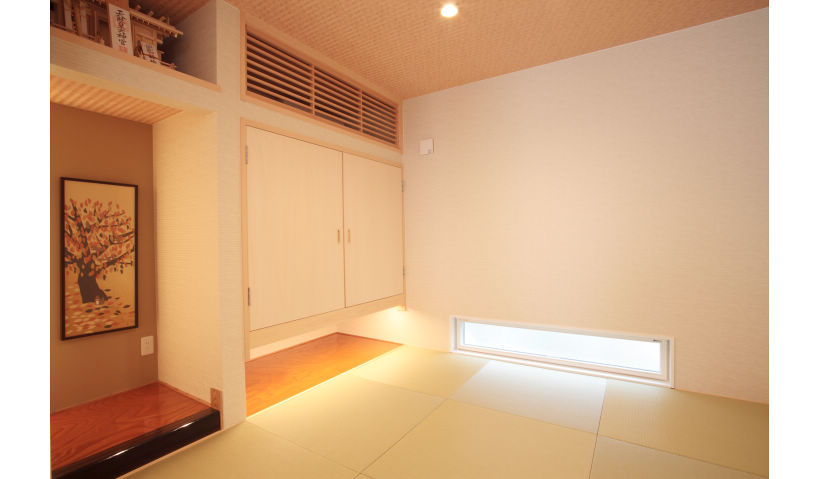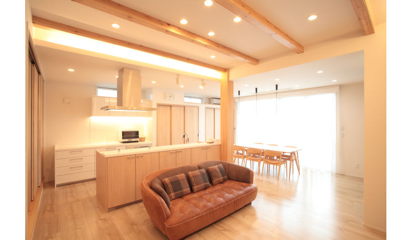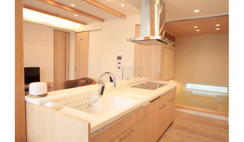 や、設備の老朽化がきっかけで建替を決意されました。建替前はリビングとダイニングが別々に分かれているなど1部屋1部屋が狭く、また収納も不足していたためベビー用品やお子様のおもちゃを片付けるのが大変だったというM様。そこで、玄関横の大型収納や洗面室、ダイニング等に適材適所の収納スペースを確保。キッチン背面の収納には、なんと冷蔵庫もすっぽり収まります。「キッチン全体が見えるので、生活感を出したくなかったんです」とM様が言うように、扉を閉めれば中が見えず、お部屋の印象もすっきり。間取りに合わせた効率的な収納スペースが、インテリアやお部屋のテイストに自然と溶け込んでいます。 現在は育休中ですが共働きで忙しい奥様のため、LDKを中心に生活動線も見直しました。回遊できるキッチンは、調理中の出し入れや行き来もスムーズ。水廻りにもアクセスしやすく、お部屋とお部屋を行ったり来たりする必要がありません。カウンターからは室内が一望できるため「家族がどこにいても家族のつながりを感じられるんです」と、奥様もニッコリ。どこへ行くにも家族が必ずリビングを通る間取りは、家事をしながらでも自然なコミュニケーションを生んでくれます。その他にも、キッチンに隣接の和室は、お子様のお昼寝スペースや洗濯物を畳んだりなど、多目的に使える憩いの空間。お部屋全体を包み込むメープル材のナチュラルな雰囲気は、インテリアがお好きなご夫妻が自らセレクトしたものだそう。家族にうれしい住み心地の中にも、さりげないこだわりが詰まっています。