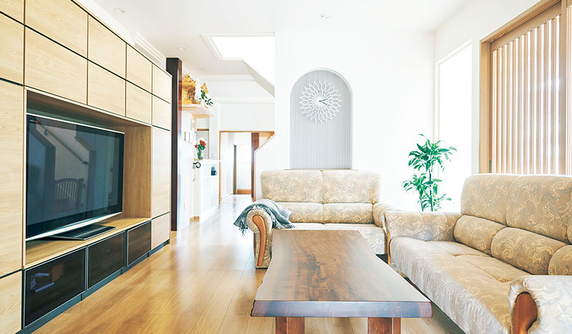 家の中心につくった明るいLDKは、使い勝手もよくなりました。玄関からの動線に無駄がなく、収納力たっぷりのキッチンへは、勝手口からスムーズに移動可能です。なにより、LDKの中心に設けた階段のおかげで、いつでも家族の気配を感じられます。家族の絆が深まる理想の家に、満足しています。