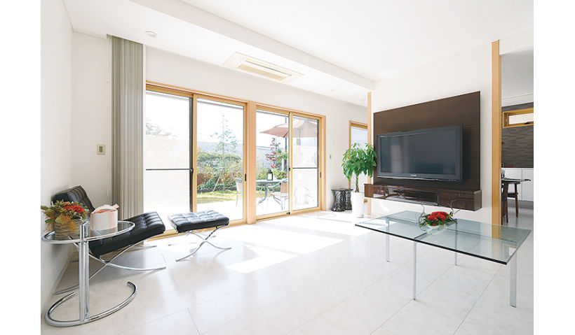 アフター:テラスに面した開放感のあるリビング。構造上抜けない間仕切り壁を生かして、リビングとダイニングを効果的に分離。