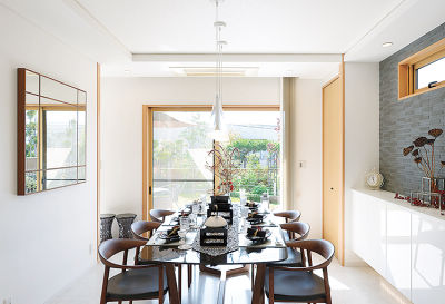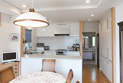 1階は料理教室としてLDKと和室を一新。石目調のフローリングなど白を基調に、サロンのようなラグジュアリーなインテリアが実現しました。「吟味して選んだテーブルや照明などが映える、おもてなしの場にふさわしい最上の空間になりました」とTさま。生徒さんからも好評です。玄関ホールや水まわりもゲスト仕様に変更しました。プライベートフロアの2階は、ご家族それぞれの個室に加えてDKや洗面コーナーを新設。「すべての部屋がきちんと機能するようになって、家が生き返ったみたいです」とイメージ以上の出来栄えに満足されています。