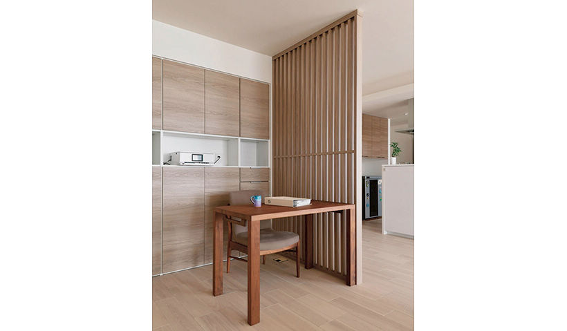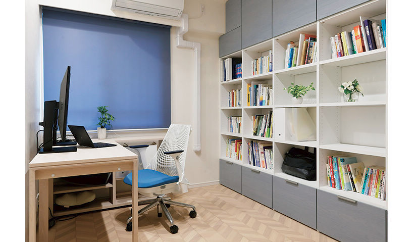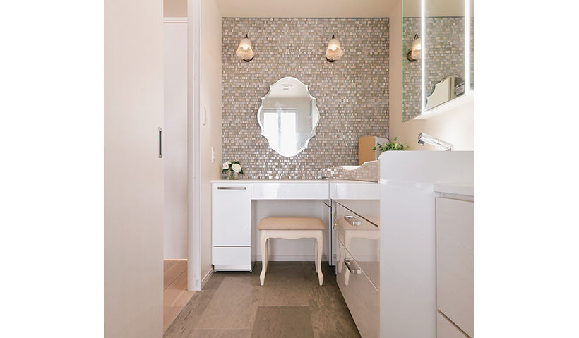 それぞれのワークスペースを確保し、広い空間を効率的に使った収納を設けて、奥様好みの“大人かわいい”をテーマに上品で洗練されたデザインで広々とした住まいを実現しました。