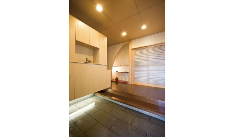 四世帯が共に暮らすK様邸。最新の設備を導入しながらも、和の雰囲気は残したいというご希望でした。特に「家の顔」となる玄関は、機能性と格調のバランスを巡り試行錯誤を重ねました。辿り着いたのは、飾り棚を正面に据え、シンプルで大容量の収納を側面に配したプラン。間接照明のやさしい光が陰影をつくり、趣のある素敵なお出迎え空間となりました。