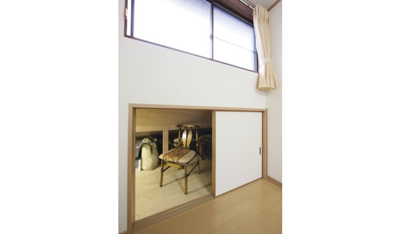 LDKと水まわりの位置を入れ替え、家族が集いやすいようLDKを家の中心に。南北に長い20畳の大空間には、南側に大きな窓を、北側のキッチンの上に天窓を設け、光に満ちた明るい空間を実現されました。限られたスペースで二世帯分の収納量を確保するため、各部屋はもちろん小屋裏までも収納として活用。お母様と3人が仲良く快適に過ごせる、共有型二世帯住宅が完成しました。