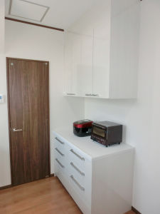 アフター:キッチンとカップボードは家事動線の短いⅡ型を採用、食器は必要量カップボードに収納できるようシステムキッチンと同じ「ラクシーナ」ではなく「Lクラス」を採用。同じ奥行き65cmでも収納量が格段違います。