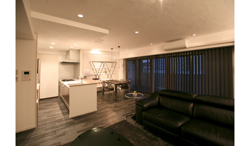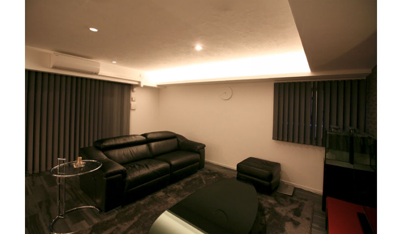 断熱性・調湿性・消臭効果が期待できるスイス漆喰で壁、天井を仕上げています。ライティングにもこだわっており、光の繋ぎ目のがないLED建築化照明で天井に光を反射させ空間の明るさと奥行を演出。スタイリッシュな空間ですが柔らかな光で包まれて温もりのあるリビングになっています。
