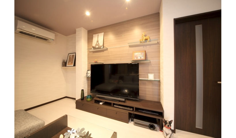 アフター:リビングのディスプレイをライトアップ。光と影のコントラストも夜間ならではの楽しみ方。テレビ背面の壁には木目柄のパネルで個性を演出。