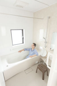 アフター:「前はタイルの床で本当に冷たかった」とおっしゃるご主人。今は予備暖房で暖かくして入浴できるようになりました。以前は灯油・ガス・電気を使用されていましたが、エコキュートも導入してオール電化に。光熱費は以前に比べて約5000円も安くなったとか。