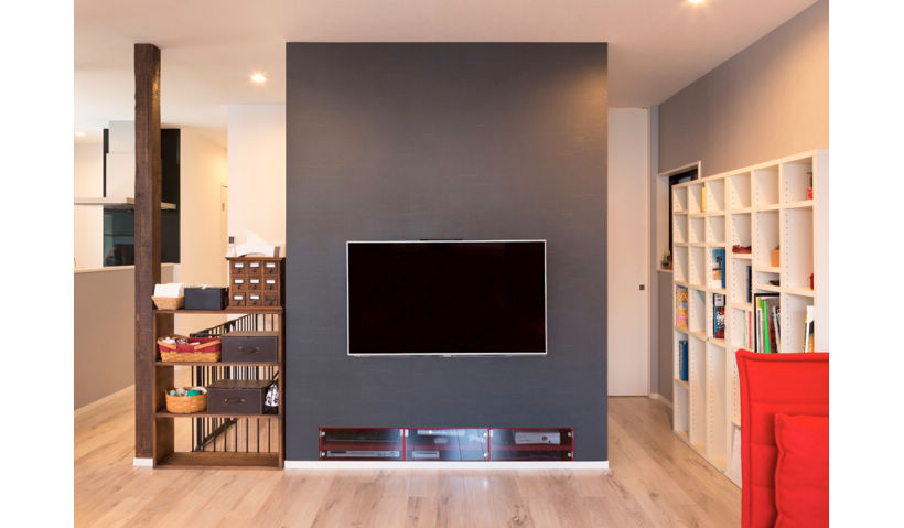 ウォークインクロゼットの壁部分に壁掛けテレビを設置。配線などが見えないようにスッキリと。