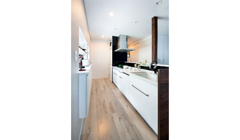 3連IHを採用したキッチン、抜けなかった柱をアクセントとして使用し、キッチンはサイズを調整して取り付けました。