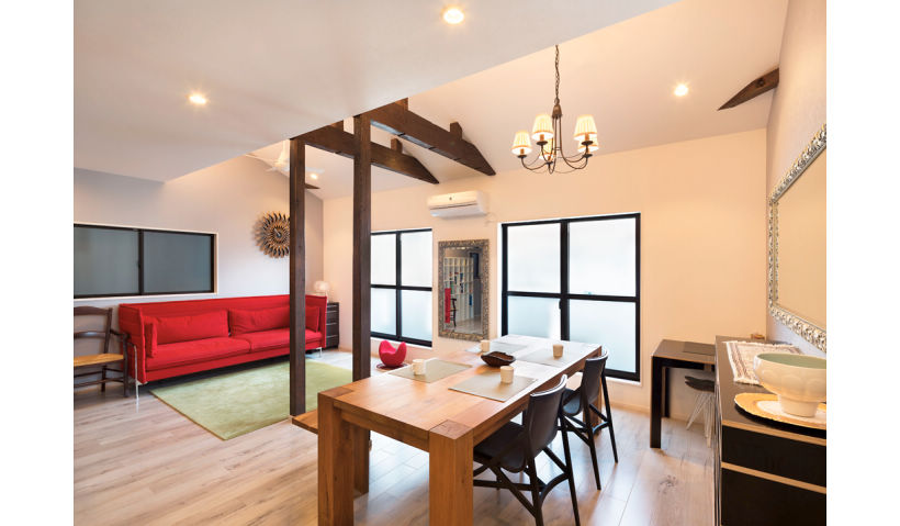 2つの洋室を取り払い、天井を生かした伸びやかな空間へ。木の味わいを生かしたナチュラルなインテリアにビビッドな赤のソファポイントです。