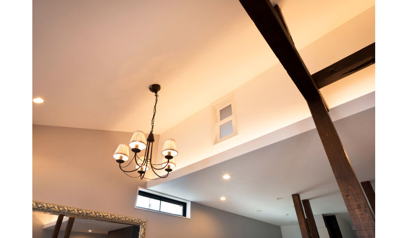 斜め天井とアクセントの柱を生かした空間。間接照明で演出しています。