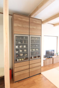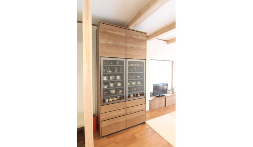 アフター:お客様用の食器はキュビオスを食器棚風にすることで、リビングにも馴染み、魅せる収納に。
