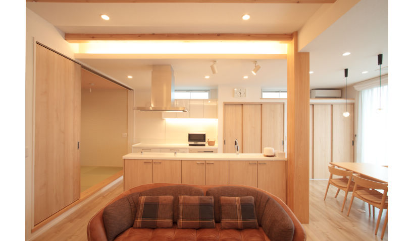 や、設備の老朽化がきっかけで建替を決意されました。建替前はリビングとダイニングが別々に分かれているなど1部屋1部屋が狭く、また収納も不足していたためベビー用品やお子様のおもちゃを片付けるのが大変だったというM様。そこで、玄関横の大型収納や洗面室、ダイニング等に適材適所の収納スペースを確保。キッチン背面の収納には、なんと冷蔵庫もすっぽり収まります。「キッチン全体が見えるので、生活感を出したくなかったんです」とM様が言うように、扉を閉めれば中が見えず、お部屋の印象もすっきり。間取りに合わせた効率的な収納スペースが、インテリアやお部屋のテイストに自然と溶け込んでいます。 現在は育休中ですが共働きで忙しい奥様のため、LDKを中心に生活動線も見直しました。回遊できるキッチンは、調理中の出し入れや行き来もスムーズ。水廻りにもアクセスしやすく、お部屋とお部屋を行ったり来たりする必要がありません。カウンターからは室内が一望できるため「家族がどこにいても家族のつながりを感じられるんです」と、奥様もニッコリ。どこへ行くにも家族が必ずリビングを通る間取りは、家事をしながらでも自然なコミュニケーションを生んでくれます。その他にも、キッチンに隣接の和室は、お子様のお昼寝スペースや洗濯物を畳んだりなど、多目的に使える憩いの空間。お部屋全体を包み込むメープル材のナチュラルな雰囲気は、インテリアがお好きなご夫妻が自らセレクトしたものだそう。家族にうれしい住み心地の中にも、さりげないこだわりが詰まっています。