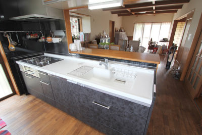 菱田 皆が使うトイレは新型アラウーノを採用しました。60代のご夫婦2人は今は若々しく元気ですが、これから迎える将来のために使いやすいアームレストを設置。トイレ内の手洗器にもこだわり、1枚板の上質なカエデのカウンターを採用。お客様と木材屋に出向きお気に入りの一枚を選びました。手洗器の水栓はセンサー水栓をご提案。小さなお子様が水を出しっぱなしにしてしまわないようセンサー水洗にしました。お孫様たちと入るお風呂は清掃性にとことんこだわり、今まであった鏡や物干しバー、出っ張りのあった照明器具、汚れやすい巻き蓋をなくし、子供達が使いやすいようにとたくさん物が置けるカウンターを2箇所取り付けました。木板貼だったお風呂隣の洗面室は、お風呂の扉開口を広げた関係で木板部分が一部壊れましたが、補修の際そこへ同じ板を貼ると日焼けで色が異なるため、自然素材で水に強い竹を施工しました。キッチンは若干サイズが変わるため、余ったスペースをステンレスカウンターとして造作し、料理上手な奥様が調味料などを多く並べられるキッチンにしました。