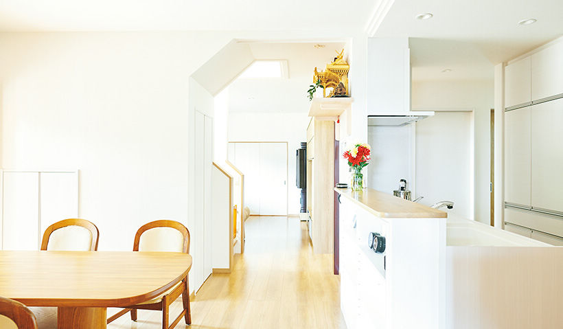 家の中心につくった明るいLDKは、使い勝手もよくなりました。玄関からの動線に無駄がなく、収納力たっぷりのキッチンへは、勝手口からスムーズに移動可能です。なにより、LDKの中心に設けた階段のおかげで、いつでも家族の気配を感じられます。家族の絆が深まる理想の家に、満足しています。