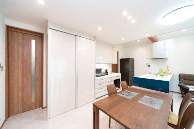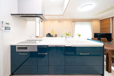 キッチンの扉柄の「あいぞめ」がアクセントとなり、シックで落ち着いたダイニングキッチンになりました。