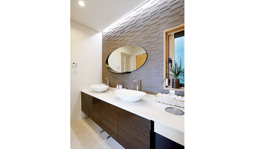 アフター:ゲスト仕様の洗面室。特注の人造大理石カウンターに洗面ボウルが映えるベッセルタイプで、壁は調湿効果のあるアクセントタイルに。