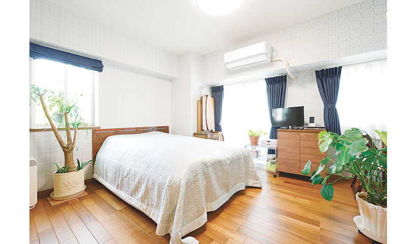 ご夫妻のこだわりは「無垢の床材を使った広々とした空間」。2室あった和室の1室をリビングに取り込んで、広いLDKに。もう1室は、リビングと一体化できるモダンな和室に変更。フロアには無垢のフローリングを採用し、木の表情が美しい建具や家具をコーディネート。木のぬくもりを感じられる心地いい大空間が実現しました。2室あった子ども室をつなげて広い主寝室に変更。ウォークインクローゼットなど充実した収納も設けられました。キッチンやバスルームなど水まわりも一新。「快適だしお手入れもラク」と奥さま。悠々自適のくらしにふさわしい、心地いいわが家になりました。