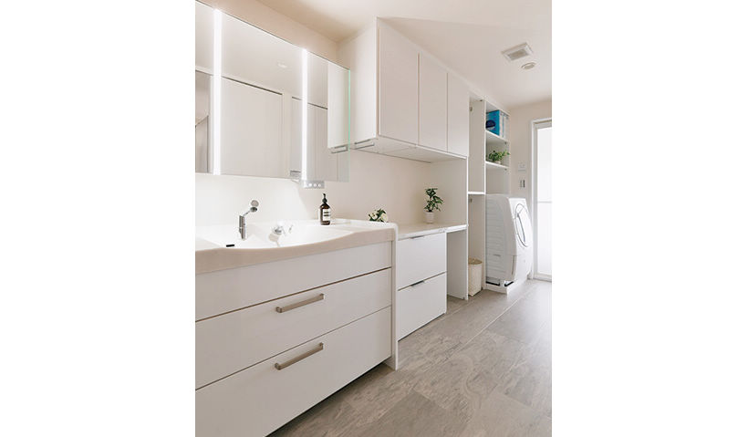それぞれのワークスペースを確保し、広い空間を効率的に使った収納を設けて、奥様好みの“大人かわいい”をテーマに上品で洗練されたデザインで広々とした住まいを実現しました。