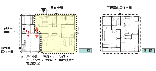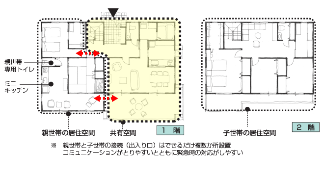 トイレやミニキッチンなどを片世帯だけに設け、ゆるやかに分離。お互いの自立を支えつつ気配は感じられる構成。