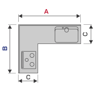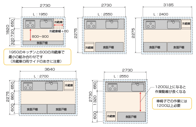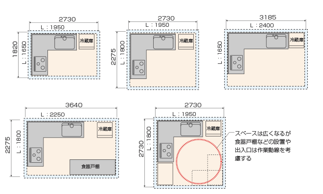 カタログ記載のL型プランでは、加熱調理器やシンク位置に決まりがあり、プラン上のレイアウトをその範囲内で行う必要があります。