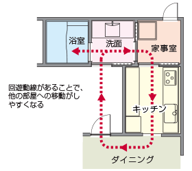 キッチン~洗面室~脱衣・浴室~トイレを回遊できるよう設計すると、家事効率が大幅アップ。