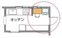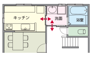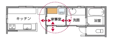 水廻りをひとつにまとめ、トイレにもつながるタイプ