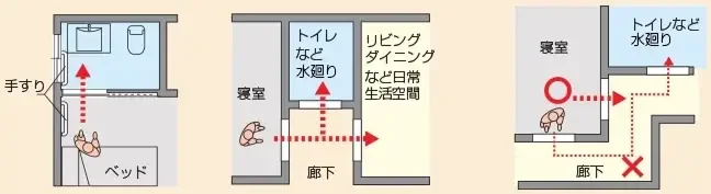トイレを寝室やリビングの近くに配置するのはもちろん、日常生活におけるスムーズな動線の確保に留意しましょう。