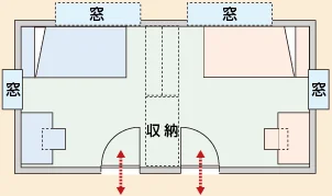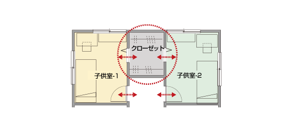 出入口とは別にクローゼットを共有し、お互いの部屋に行き来できる2WAY