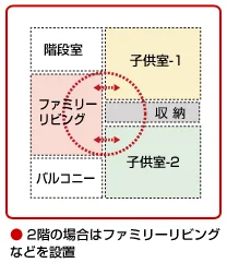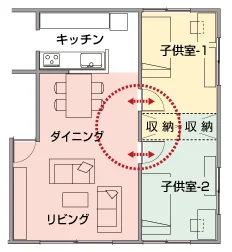 - リビングから子供室への動線を確保することで、日常の見守りもスムーズに。