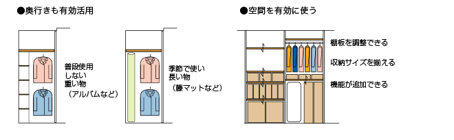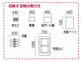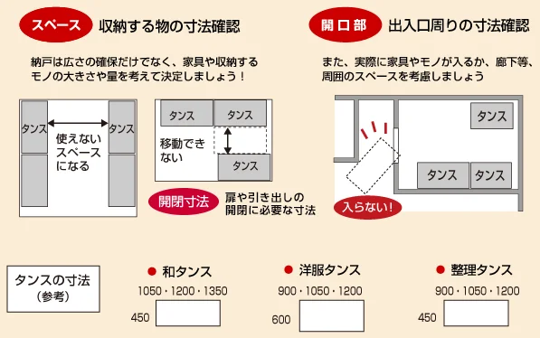 衣類収納(ハンガーパイプ使用)には600mm以上、奥行き450mm前後は棚収納に適しています。タンスなど大型家具を置く際は、扉の開閉スペースも考慮が必要です。