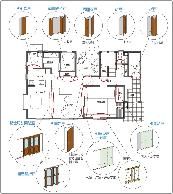 ドアや窓などの開口部は、採光・通風・プライバシー確保といった機能だけでなく、動線や空間の印象にも大きな影響を与えます。こちらでは主な開口部の種類をご紹介します。